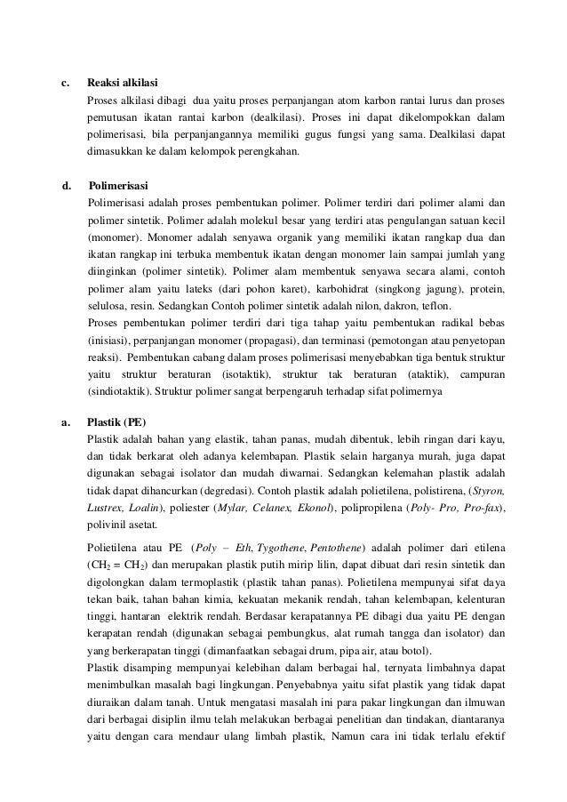 Kimia xii mirryapriadi. Polimer yang sudah ada dialam (polimer alam), seperti 1. Amilum dalam beras, jagung dan kentang. 2. Selulosa dalam kayu. Three. Protein terdapat dalam daging. Four. Karet alam diperoleh dari getah atau lateks pohon karet. Karet alam merupakan polimer dari senyawa hidrokarbon, yaitu. Jendela informasi jenisjenis plastik. Ada 2 (dua) macam yaitu low density polyethylene (ldpe), diperoleh karena proses polimerisasi tekanan tinggi, berat jenis kurang dari zero.94 excessive density polyethylene (hdpe), diperoleh karena proses polimerisasi tekanan rendah, dipergunakan sebagai bahan baku pembuatan barangbarang plastik, misalnya kantor plastik, untuk isolator listrik. Plastik wikipedia bahasa indonesia, ensiklopedia bebas. Plastik merupakan material yang baru secara luas dikembangkan dan digunakan sejak abad ke20 yang berkembang secara luar biasa penggunaannya dari hanya beberapa ratus ton pada tahun 1930an, menjadi a hundred and fifty juta ton/tahun pada tahun 1990an dan 220 juta ton/tahun pada tahun 2005. Sampai berapa lama sampah plastik bisa terurai?. Plastik yang terbuat dari bahan dasar minyak bumi beserta dengan aneka bahanbahan lain yang ditambahkan dalam pengolahannya. Tidak bisa terurai dengan cara yang serupa misalnya seperti bahanbahan organik. Proses pembuatan kaca dan bahan dasarnya arafuru. Soda juga bisa diperoleh dari natrium nitrat, bikarbonat, dan kerak garam. Feldspar seluruh bagian dari feldsper merupakan oksida yang dapat dipakai untuk membentuk kaca.